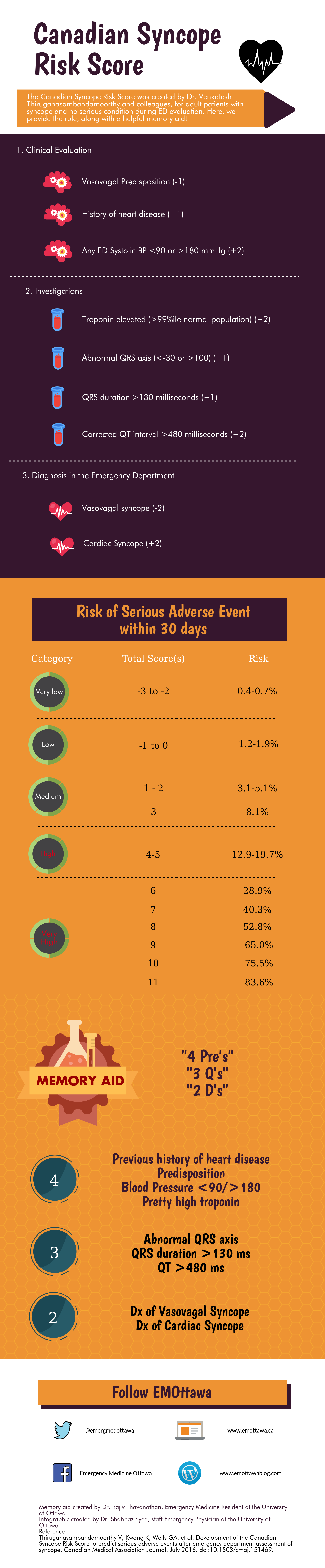 Recently, Dr. Venkatesh Thiruganasambandamoorthy et al published the Canadian Syncope Risk Score, for the assessment of adult patients with syncope. He has previously helped provide some insight into the decision rule, and we now present an infographic and memory aid to help recall the score!