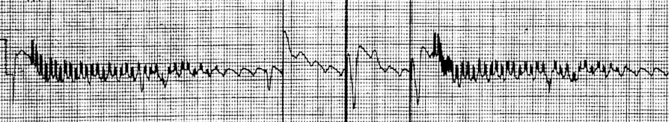 - ECG shows intermittent ventricular capture at a rate slower than normal with numerous spikes at a very high rate with different voltages and often without capture beats, simulating an ECG artifact