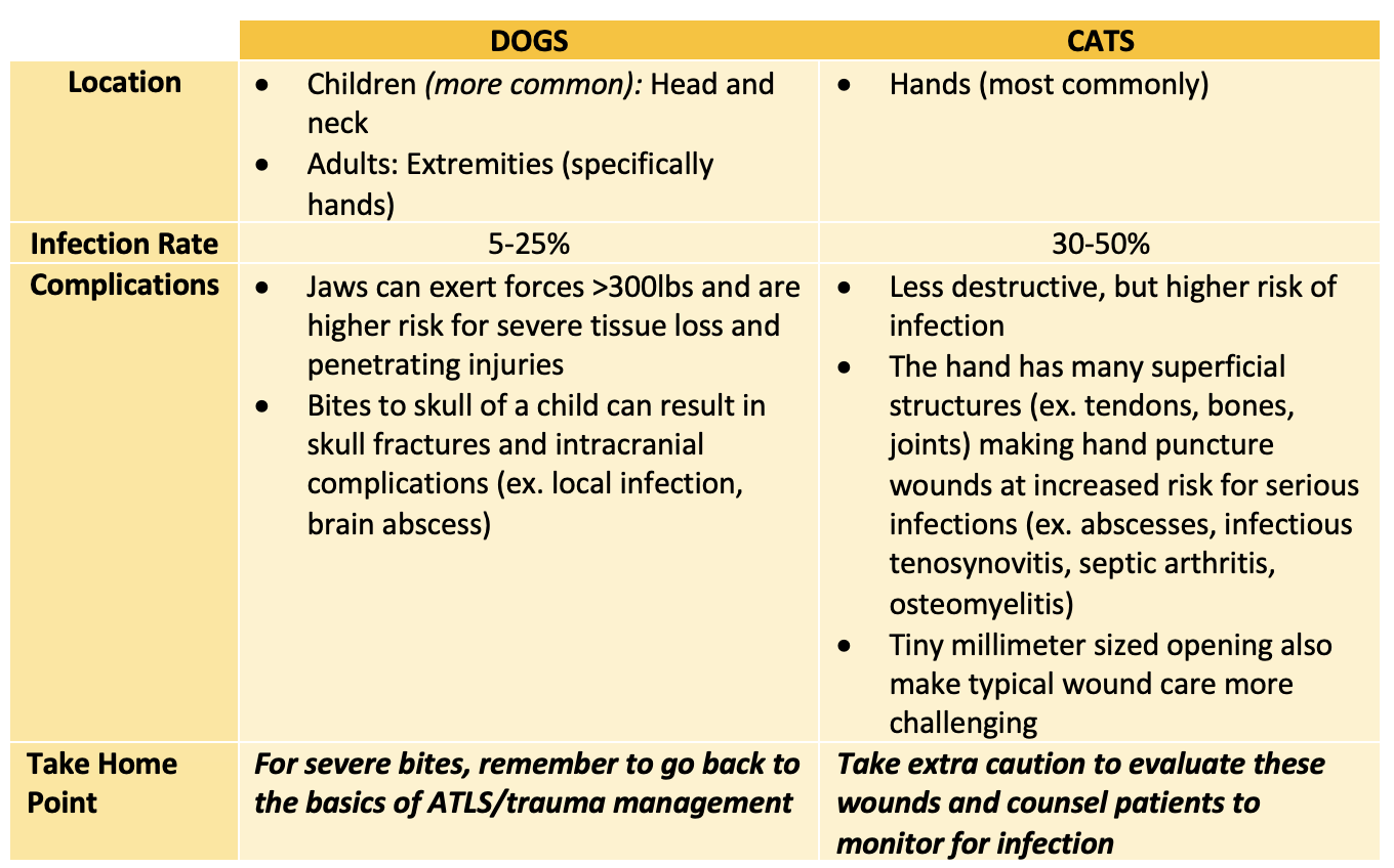 Bite related injuries represent 1% of ED visits each year, with the most common bites being from dogs (90%) and cats (10%). While dog bites can cause more damage from shear force, cat bites pose a unique risk of infection because of their needle like teeth that can inoculate deeper structures.
