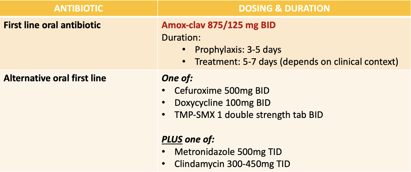 - There isn’t much great evidence regarding the role of IV vs. oral antibiotics specifically for bite wounds. Again, this largely comes down to clinical judgement.