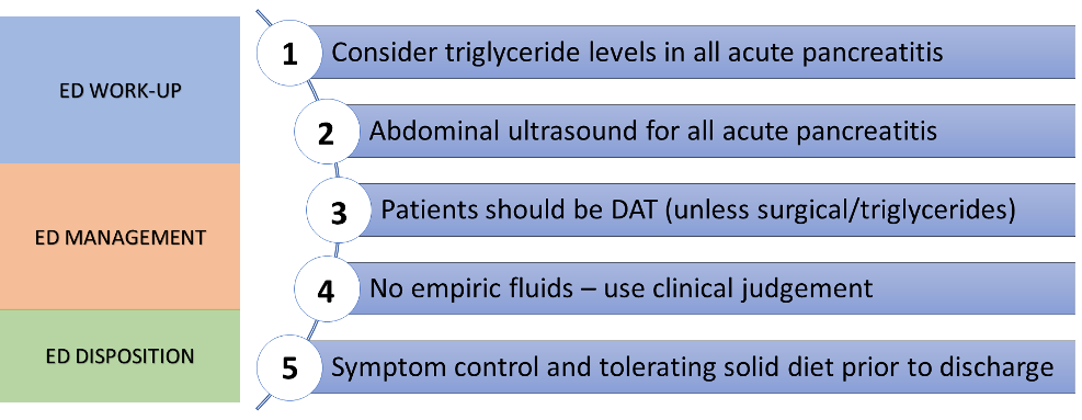 Historically, the teaching was for patients with acute pancreatitis to be nil per os (NPO) due to concern of food increasing pancreatic stimulation and worsening disease process. But current evidence has shown that NPO status can lead to GI mucosal atrophy, bacterial overgrowth, and higher rates of sepsis and infection. But how do we achieve this in the ED and how quickly can we allow patients to eat?